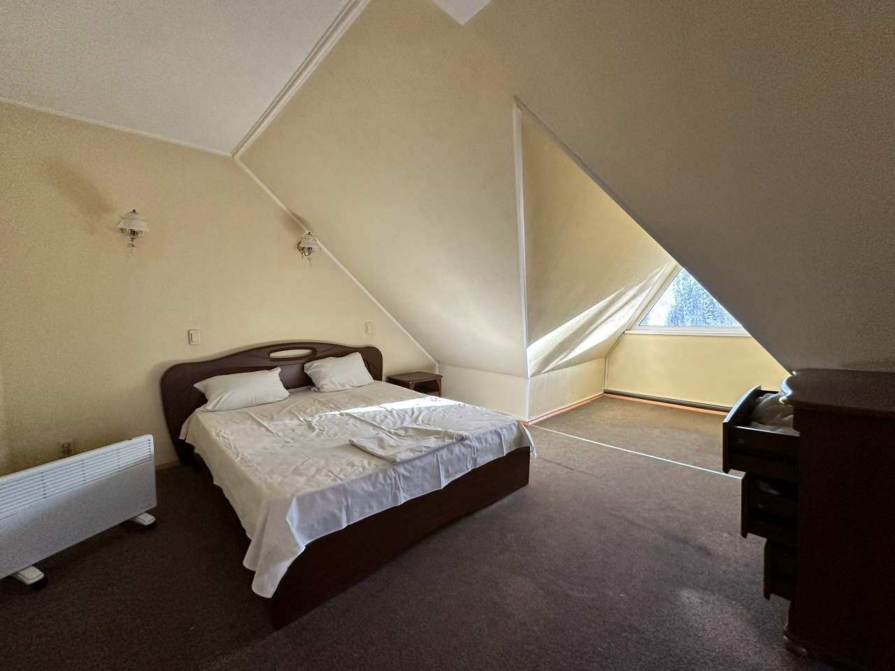 В номере: 2 двухспальные кровати, 2 двухспальных дивана. Бытовая техника: телевизор, микроволновая печь, чайник, холодильник. Сан.узел, душ, стол, стулья.